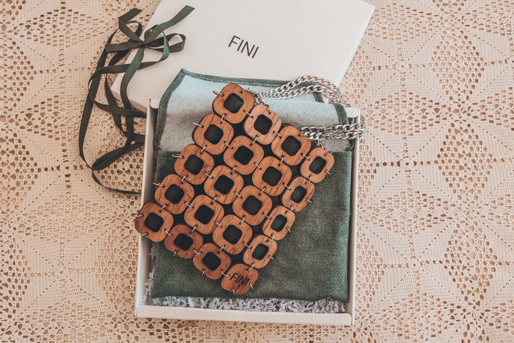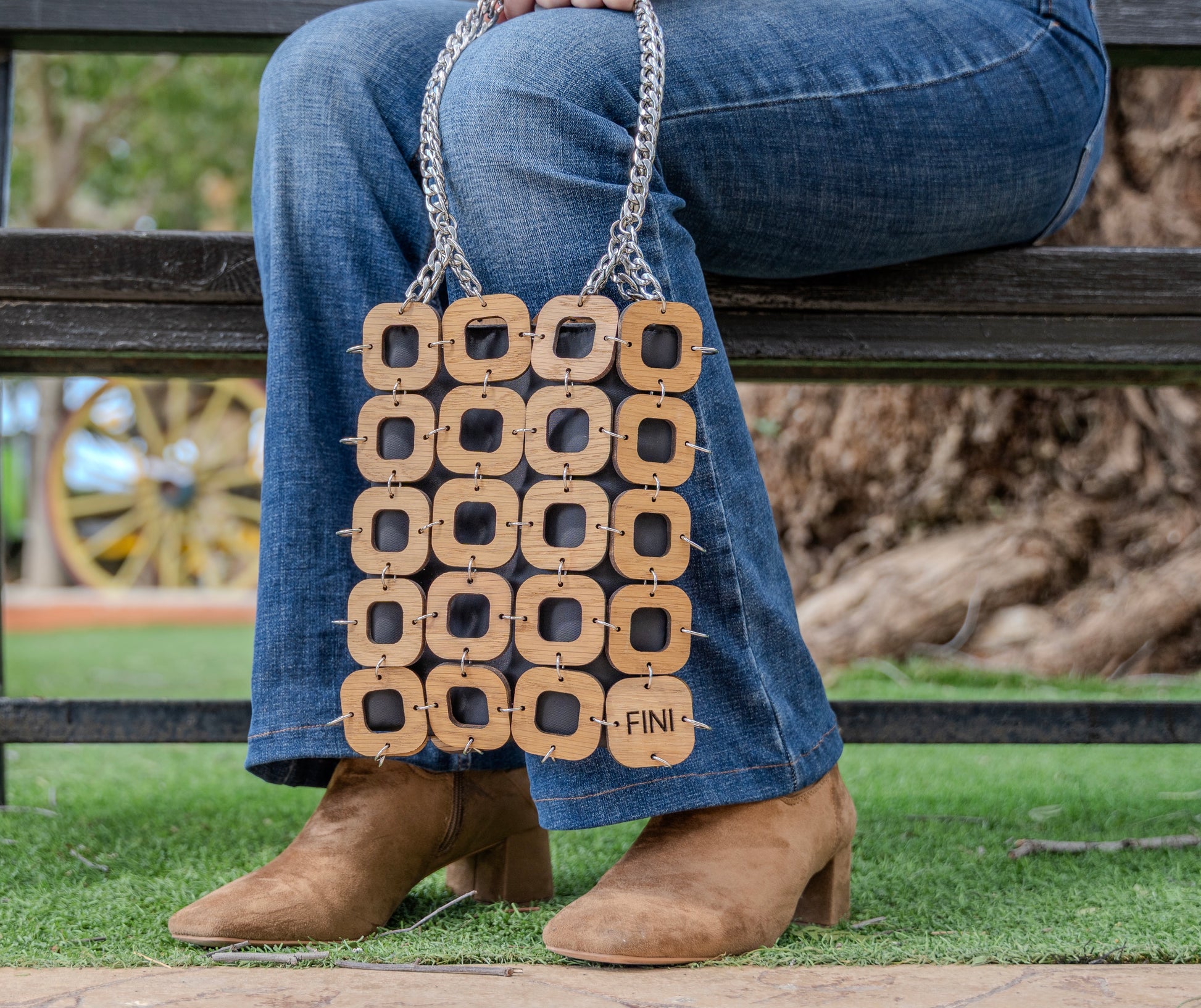 When I designed the Montage, I wanted to create something that would make you stop and think differently about what a bag could be. Each interlocking wooden square is precisely laser cut by me, carefully crafted to create this mesmerising lattice that dances with light and shadow as you move. It's like carrying a piece of wearable architecture - structured yet organic, geometric yet warm.